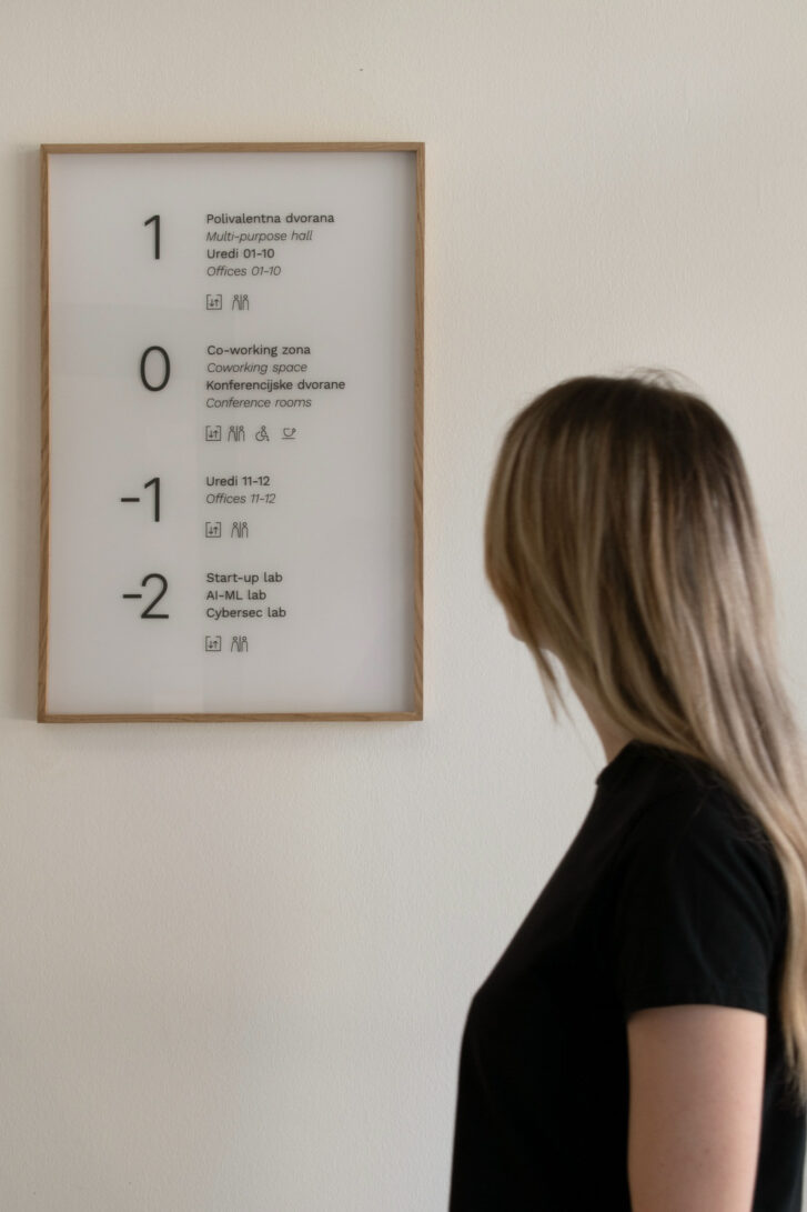 Intervention within the historically protected “Split 3” architecture that revitalizes the old retail space with a new purpose. It will become ICT Incubator and a new county meeting hall. A place of gathering, creation and establishment of new companies characterized by the workplace area and stimulus of innovative tech firms. Besides being a work incubator the project is also a programmed extension of county’s public body as well as the local student campus. The projects was finalized by also designing the interior and wayfinding system. Wayfinding elements like type, icons, and materials chosen are connected to the interior forms and space functionality.
